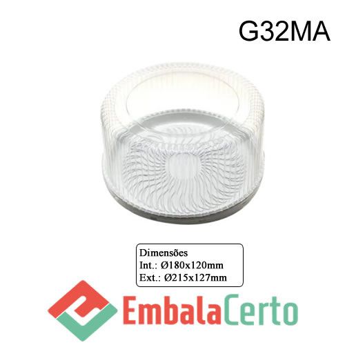 Embalagem redonda para bolo com tampa alta transparente e base branca, ideal para armazenar e transportar bolos e tortas de até 750g.